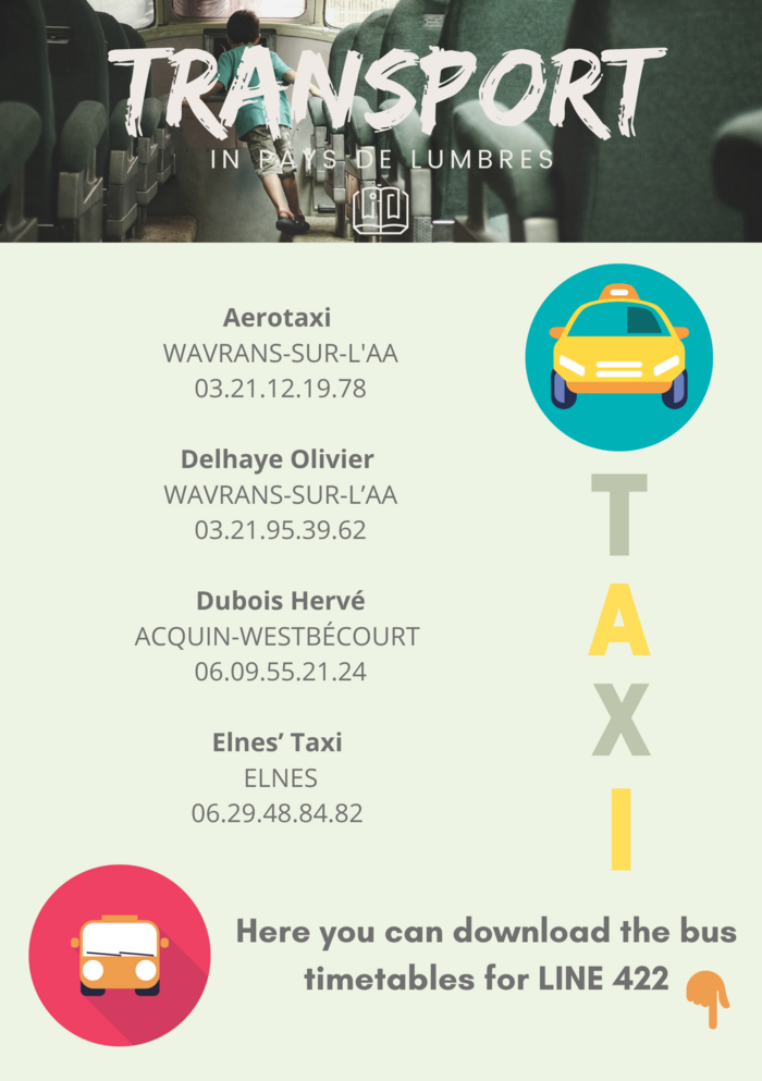 Accédez aux informations sur les services de bus et de taxis locaux pour vous déplacer facilement en Pays de Lumbres. Grâce à nos infos sur les transports, voyagez l’esprit tranquille et profitez pleinement de chaque moment de votre séjour.